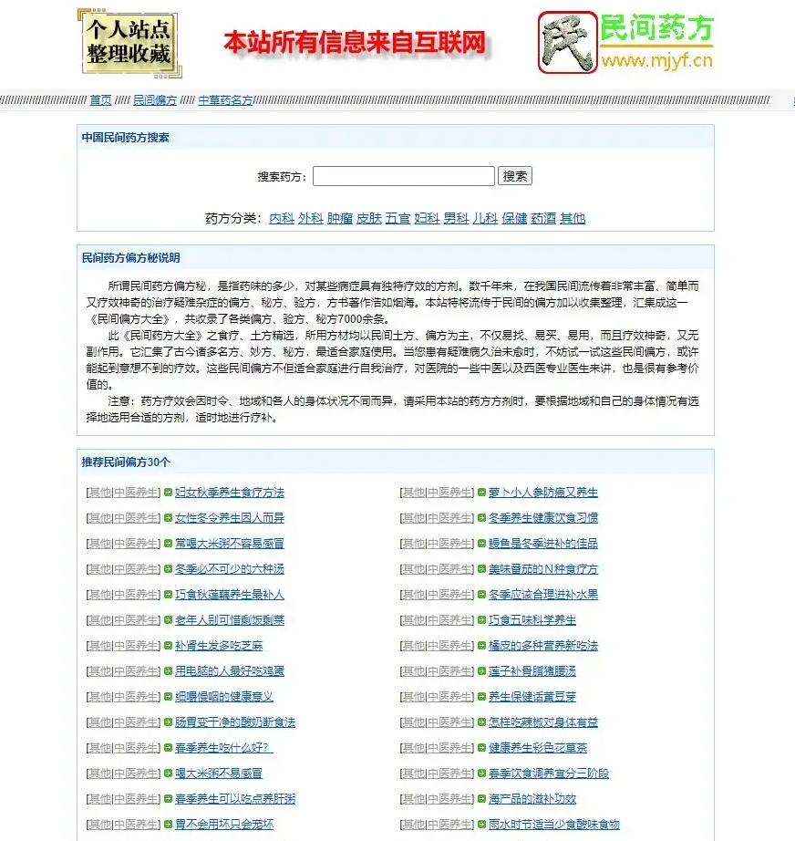 民间药方偏方网整站源码带数据,php版,不需要数据库,数据文件在dat数据格式的文件里,内容包含偏方和药方两部分,有搜索功能!可以结合其他的程序做成比较大的网站!